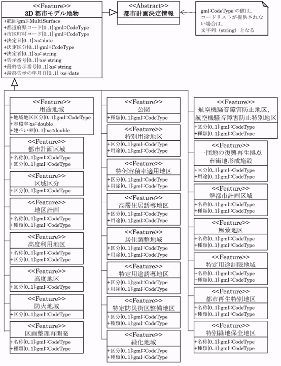 | 作成方法 | 国土交通省 都市局にて、2024年度(令和6年度)に地方公共団体等より情報収集・データ整備を行った「都市計画決定GISデータ」を原典とし、製品仕様書に準拠したデータ構造等となるよう編集加工を行い、 国土数値情報(都市計画決定情報)として整備した。なお、データ設計にあたっては、都市計画決定GISデータのデータ定義書、CityGML仕様書を参照した。 | ||