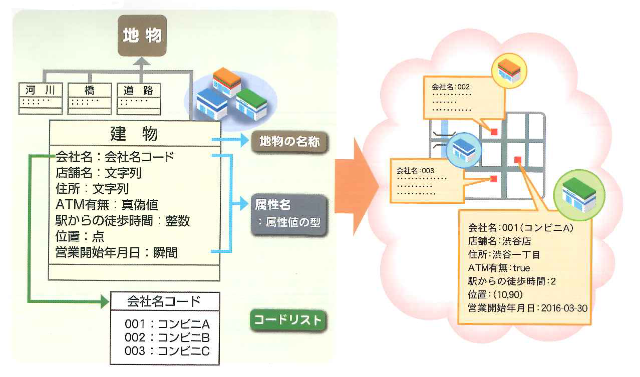 真ん中の区画には、地物の属性を記述します。この区画には、属性の名前(属性名)、や属性の値の種類(属性値の型)を記します。図中の「建物」という地物は「会社名」という属性(属性の型は「コード型」)や、 「店舗名」(属性値の型は「文字列型」)などの属性を持つと定義されています。